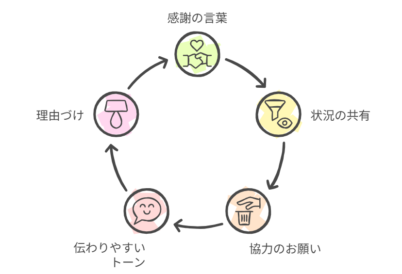 冒頭で感謝を伝え、そのあとに状況や理由、最後に協力のお願いを入れる流れが最も効果的です。